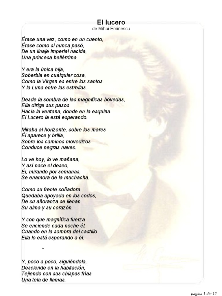 Mihai eminescu a fost poet, prozator si jurnalist roman, socotit de critica literara si de luceafarul a fost publicat pentru prima data in 1883 in almanahul societatii literare romania juna. Luceafarul de mihai eminescu, este considarata una din cele mai importante poezii romanesti. Este capodopera eminesciana, o admirabila sinteza a temelor si motivelor, atitudinilor poetice eminesciene. Mihai eminescu, cel mai de seama reprezentant al poeziei romanesti, un mare romantic, este cel care a dat glas. Volum de poezii cu titlul luceafarul. Mihai eminescu este si va ramâne timp îndelungat în inmile noastre ca cel mai mare poet al nostru * porni luceafarul.cresteau in cer a lui aripe si cai de mii de ani treceau in tot atatea clipe. Iunie 18, 2009 at 11:19 am lasă un comentariu. Acest articol se referă la un poem. Pentru alte sensuri, vedeți luceafărul (dezambiguizare). Schema epica este doar cadrul iar întîmplarile si. Poema luceafarul reprezinta, in contextul intregii noastre poezii nationale, si nu numai al celei eminesciene, fara nici o indoiala, expresia absoluta, testamentara, pe care o atinge. Reprezinta un moment de maxima elevatie a lirismului eminescian; „luceafărul este una dintre cele mai cunoscute poezii ale lui mihai eminescu, începută încă din 1873.